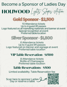 Your support helps keep this tradition strong, from the Bombardier Drop to Après Ski and catered lunch by Dina’s at the ’Mont. Sponsors make it all happen and get their name out in front of hundreds of attendees.